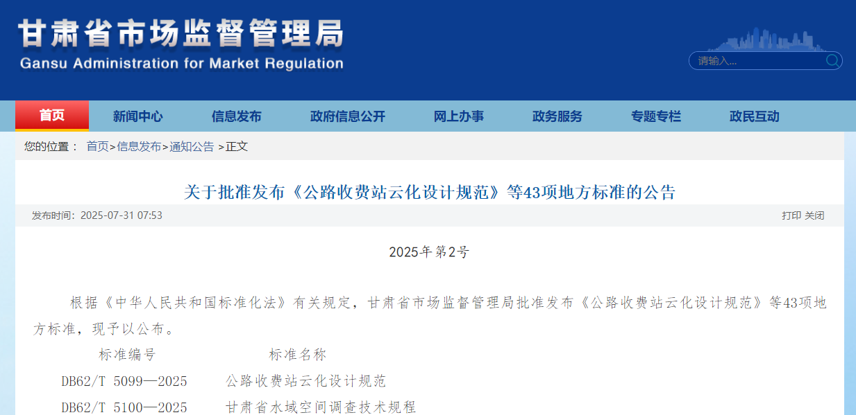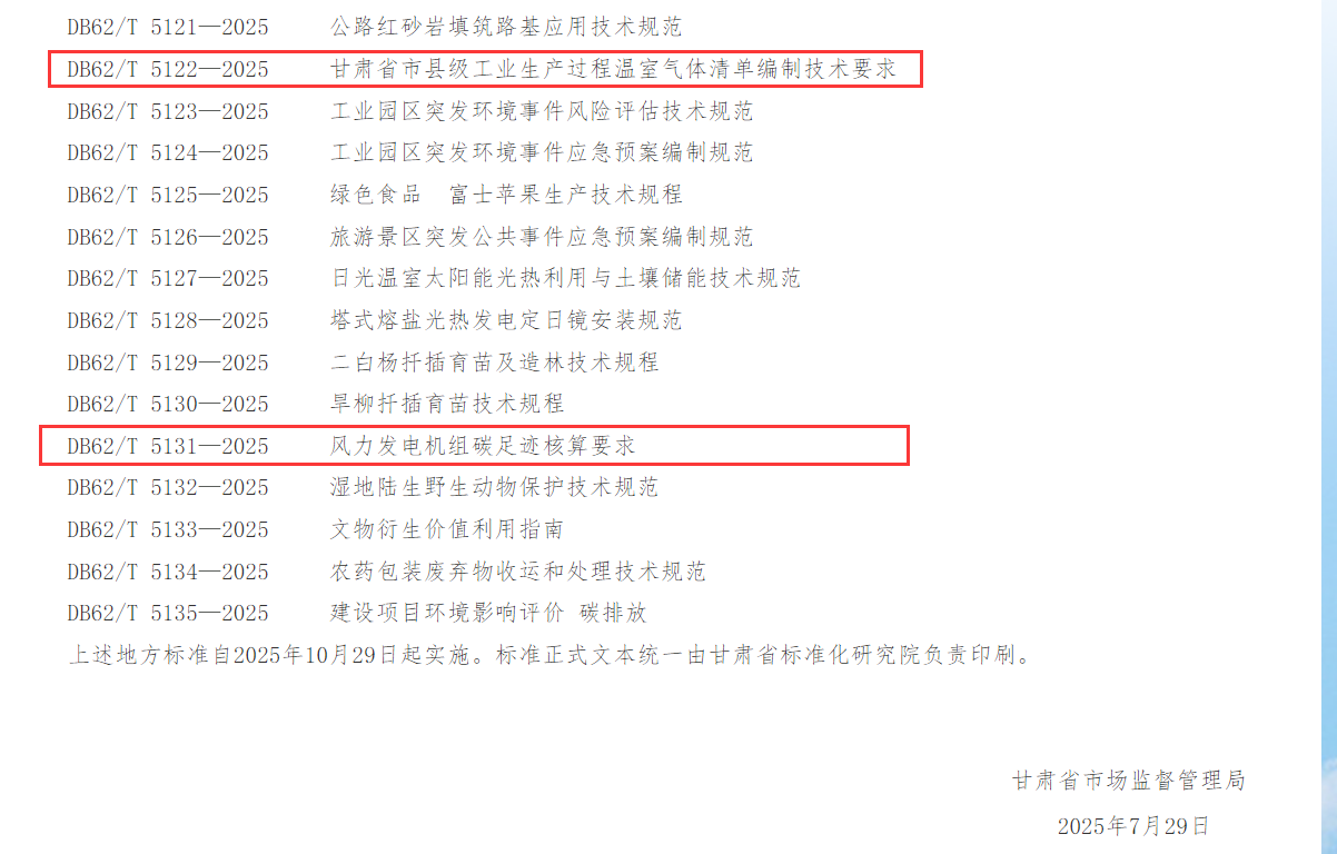 近日,甘肅省市場監督管理局印發了《關于批準發布〈公路收費站云化設計規范〉等43 項地方標準的公告》(2025年第2號),我單位牽頭或參與起草的《甘肅省市縣級工業生產過程溫室氣體清單編制技術要求》(DB62/T 5122-2025)和《風力發電機組碳足跡核算要求》(DB62/T 5131-2025)2項地方標準獲批發布,并將于10月29日正式實施。