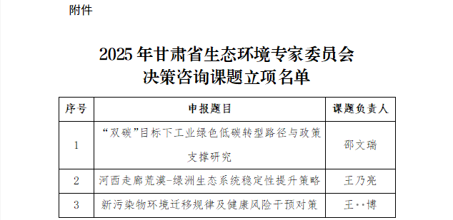 我單位申報(bào)的2025年甘肅省生態(tài)環(huán)境專家委員會(huì)決策咨詢課題獲批立項(xiàng)